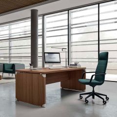 Halfrond luxe directiebureau verkrijgbaar voorzien van een frontpaneel onder het bureau. Standaard is het bureau voorzien van een mooie en praktische aanbouw met ladeblok zodat niet alleen het bureau wordt vergroot, maar ook direct handige opbergruimte gecreëerd wordt. U kunt dan uit diverse handgrepen kiezen. Het bureau kan ook worden geleverd zonder aanbouw. Het bureau heeft een robuust en stijlvol uiterlijk door de grote ronde poten en het metalen frontpaneel. Het blad en de panelen zijn afgewerkt met een toplaag van zeer goede kwaliteit melamine (wasbaar, antikras en antispiegeling).