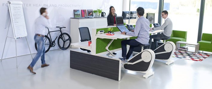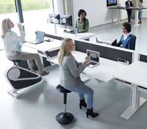 Naast het afwisselend zittend en staand werk, is het ook belangrijk om voldoende te bewegen tijdens de werkdag. Maak gebruikt van een fietsbureau, balanskruk of ergonomische zitbal. Naast deze hulpstukken kan er bijvoorbeeld ook lopend en staand worden vergadert, kunnen oefeningen aan het bureau worden gedaan of kan de trap genomen worden in plaats van de lift. Meubilair kan ondersteunend zijn om medewerkers meer te laten bewegen. Graag voorzien wij u van advies om een kantoorruimte zo in te richten dat meer bewegen wordt bevorderd wat niet alleen voor de werknemer gezond is, maar ook de werkgever helpt aan gezonde en actieve medewerkers.