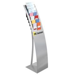 De folderdisplay First is een stijlvolle en representatieve display voor de gebruikelijke formaten folders als A4, A5, DIN lang en DIN A4. De display is gemaakt van staal en is afgewerkt met een antraciete coating. De compartimenten waar de folders in geplaatst kunnen worden hebben een zilveren kleur en zijn voorzien van een doorzichtig vlak zodat de folders blijven staan.