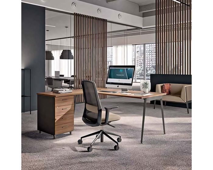 Het bureau wordt geleverd inclusief een ladeblok met 2 materiaalladen en een hangmappenlade, optioneel kunt u kiezen voor een ladeblok met 4 materiaalladen. De handgrepen op de lades hebben dezelfde kleur als de poten van het bureau. Het bureaublad is 2,5 cm dik en is afgewerkt met een beschermende melamine toplaag.