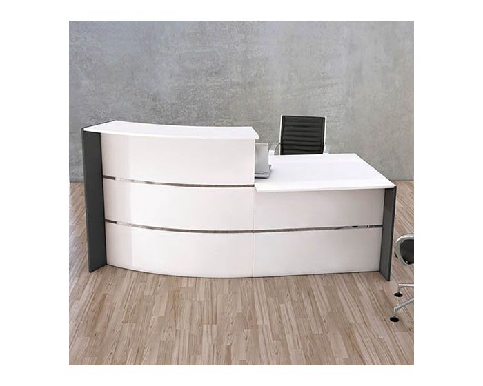 De receptiebalie Low is voorzien van een hoog en laag gedeelte. De balie is afgewerkt met een melamine toplaag en heeft een bureaublad met een diepte van 80 cm. De voorkant van de receptiebalie is voorzien van roestvrij stalen strips wat zorgt voor een stijlvol en modern uiterlijk. Ook de optioneel beschikbare LED lamp strip helpt mee aan een moderne en opvallende uitstraling. Beschikbare kleuren zijn wit en antraciet en u kunt kiezen voor een opslagruimte met of zonder afsluitbaar deurtje (de opslagruimte zit standaard onder de hoge kant van de balie). Tevens is er kabeldoorvoer aanwezig om kabels overzichtelijk weg te werken.