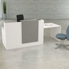 Receptiebalie Juso met een hoek van 90 graden. De receptiebalie heeft een wit melamine topblad en een zilveren stalen voorzijde. De witte strepen aan de voorzijde geven de receptiebalie een design uitstraling. Het topblad heeft standaard 2 kabeluitgangen en voor maximaal kabelmanagement kunt u eventueel kiezen voor een kabelgoot. Daarnaast kunt u kiezen voor een ladeblok (standaard wit van kleur). De receptiebalie Juso hoek is ook verkrijgbaar in een rechte variant.