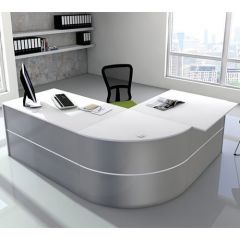 Met de receptiebalie Lias maakt u gegarandeerd een positieve eerste indruk. Het grijze paneel op de witte receptiebalie brengt een design uitstraling met zich mee. Het werkblad is afgewerkt met een melamine toplaag waardoor het naast krasvast, ook eenvoudig schoon te maken is. Daarnaast is het werkblad standaard voorzien van 2 kabeluitgangen om de overzichtelijkheid te bewaren. Optioneel kunt u kiezen voor een opslagruimte onder de receptiebalie aan de rechterzijde. Deze opslagruimte is voorzien van een verstelbaar legbord en kan ook met afsluitbare deur worden geleverd.