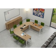 Vergaderopstelling geschikt voor 8 tot en met 12 personen. De opstelling bestaat uit 5 bureaus. Elk bureau is voorzien van een stijlvol frontpaneel in dezelfde kleur als het blad van de tafel. Het blad van de vergaderopstelling "zweeft" iets boven het frame, zodat dit een design uitstraling heeft. Indien u de kleur beter wilt bekijken kunt u vrijblijvend een kleurstaal opvragen bij onze klantenservice.